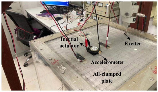 Thin plate materials are widely applied in engineering fields, including aerospace engineering, ships and warships, vehicle engineering and mechanical engineering, due to their light weight and large flexibility [1,2]. However, it is very easy to be excited by model uncertainties, higher harmonics and unknown external excitations, resulting in resonance and noise, structural damage, safety reduction and system collapse. In addition, there are other factors causing vibration, such as shell vibration caused by marine propulsion shafting, coupling vibrations between traction motor and driveline and the panel fluttering caused by air flow in a narrow passage [3,4,5]. Therefore, vibration suppression has great research significance in engineering fields [6,7]. In recent years, inertial actuators have been widely pasted on the all-clamped plate as actuators of vibration suppression control, because inertial actuators can precisely suppress vibration in a broad band with rigorous structural requirements [8,9].
