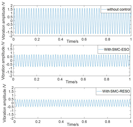 The results of the experimental comparison for the two controllers are shown in Figure 5, where the output voltage amplitude before the control is approximately equal to 1.65 V. When the SMC-ESO controller is adopted, the amplitude is reduced to 0.75 V, which is reduced by 54.5%. When the SMC-RESO controller is adopted, the voltage amplitude is dropped to 0.41 V, reduced by approximately 75.2%. Obviously, the vibration control performance of the all-clamped plate based on SMC-RESO method is better than SMC-ESO.