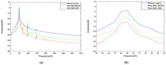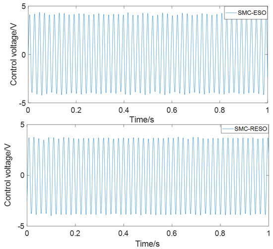 In addition, Figure 6 shows the FFT results of vibration amplitude. As is shown, the amplitude value of vibration has been reduced from 2.65 dB to −5.67 dB with the SMC-ESO method, decreased by approximately 8.32 dB. After adopting the SMC-RESO controller, the amplitude has dropped from 2.65 dB to 10 dB, a total decrease of 12.65 dB. The control voltages of the two controllers are seen in Figure 7. The control voltage of SMC-ESO controller is 4 V, and the control voltage of SMC-RESO controller is 3.7 V. Compared with the two control voltages, the SMC-RESO controller has better control performance with lower control voltage. Data analysis is shown in Table 2.