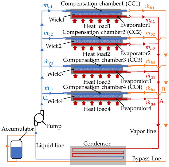 There are two flow paths in the wick-type 2PMPFL. One is the main flow path, where the working fluid flows from the liquid line’s divergence point C through the primary wick in each evaporator, the vapor line junction point A, the condenser, and then returns to point C. The other is the bypass flow path, where the working fluid flows from the liquid line’s divergence point C through each compensation chamber (CC), the bypass line junction point B, and then returns to point C. An accumulator was installed near the mechanical pump to regulate the amount of working fluid in the fluid loop when the heat load varies.