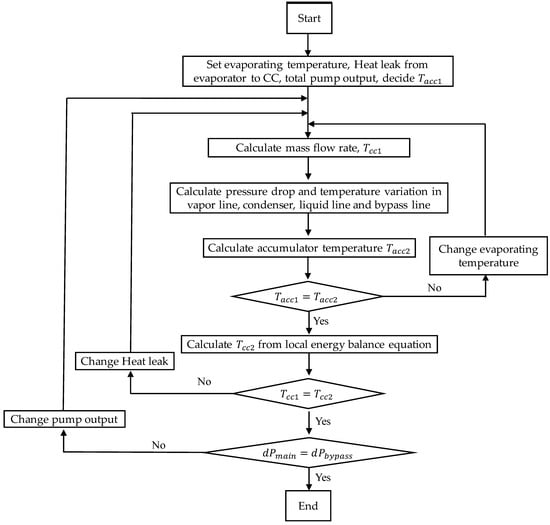 After inputting the accumulator temperature and consequently the heat load conditions at each evaporator, the initial value of the pump output, evaporating temperature in the evaporator, and heat leak from the evaporator side to the CC side were set. Next, the mass flow rate in the main and bypass flow paths and the CC temperature were calculated using the initial and input values. Thereafter, the temperature and pressure values in the vapor, condenser, liquid, and bypass lines were sequentially ordered along the flow direction of the working fluid. The accumulator is saturated with vapor–liquid, which allows for the calculation of a second temperature, , using the saturation vapor curve, provided the pressure value of the accumulator is available. The calculation result for the accumulator’s temperature is acquired by adjusting the initial value, , until the difference between and is less than 0.1 °C.
