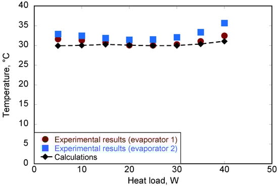 Calculations and experiment results of the two-evaporators type LHP’s each evaporator case’s temperature according to the reference [48] (wick material: stainless steel 316L, working fluid: ammonia).