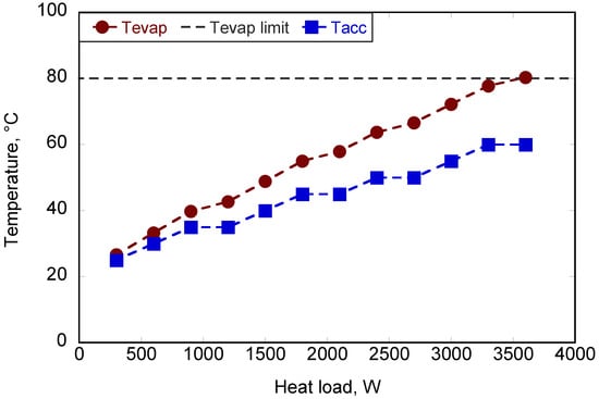 The following calculations of the wick-type 2PMPFL with four evaporators were performed under the assumption that the pump operated at its optimal output. The factors investigated were the mass flow rate in each flow path, the minimum operating temperature of the accumulator, and the operating behavior of the evaporators and CCs. Figure 5 shows the calculation results for the evaporator temperature and the lowest accumulator temperature under even heat load conditions. The heat load for each evaporator was increased from 0.3 kW to 3.6 kW with an increment of 0.3 kW. The wick-type 2PMPFL operated until the heat loads were increased to 3.6 kW, where the operating temperature of each evaporator was higher than the 80 °C limit. The wick-type 2PMPFL transferred a total of 13.2 kW (3.3 kW for each evaporator), which satisfies the design requirement of a total heat transfer capability of 12 kW (3 kW for each evaporator).