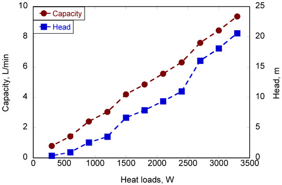 Figure 7 shows the head (Equation (24)) and capacity (Equation (25)) under each corresponding heat load condition when the optimal pump output was realized. The mechanical pump, which satisfies both requirements, will be selected in the future.