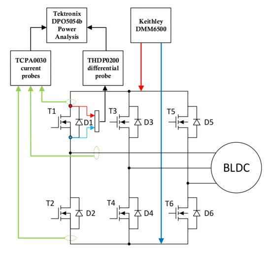 The values of power losses in the inverter in relation to the sensor arrangement error were determined while maintaining a constant rotational speed and a constant load torque. By modifying the parameters of the control system, the transistor’s commutation point was shifted as if the Hall B sensor’s position changed every 1 mechanical degree in the range (1–20)° while taking measurements. The power losses in the inverter transistors were determined for each transistor separately on the basis of the values of currents and voltages measured by the circuit shown in the picture (Figure 3) using the advanced power analysis option of the Tektronix DPO5054B oscilloscope (Tektronix DPO-PWR (power measurement and analysis)) (Figure 3). The above test procedure helps to reproduce the actual conditions of continuous operation of the engine and enables the determination of losses in the inverter’s semiconductors in the steady state condition with the load torque and rotational speed unchanged. In addition, the measurement method (Figure 3) helps to determine the RMS value and the current amplitude separately in each inverter transistor, and thus allows for the precise determination of their power losses.