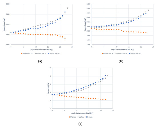 The results of the laboratory tests are presented below. Figure 4 shows the results of experimental research on power losses and the values of effective phase currents as a function of the shift angle of the Hall B sensor. Figure 4a shows a diagram of power losses in the upper transistors of the inverter. It can be observed that the power losses in the upper phase U and V transistors in the range (0–10)° increase linearly, while this relationship becomes exponential in the range (11+)°. For an exemplary shift of the sensor by 20° from the optimal position, the increase in the value of power losses is 700 mW, which gives a change of 43%. It is worth noting that the increase in power losses occurs only in the U and V phases, while the power losses change insignificantly in the W phase. Figure 4b shows that the power losses in the lower transistors of the inverter have a similar waveform. These values also include body diode losses, which are strongly related to the transistor parameters.