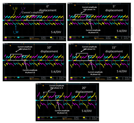 On the basis of the measurement oscillograms, it can be seen that with the increased shift angle, the amplitudes of the U and V phase currents also increase from 6 A to 11 A for a 20° shift, while the current amplitude remains unchanged in the W phase. Along with the increase in the phase currents asymmetry, the noise emitted by the drive functioning in this way and the fluctuations of the electromagnetic moment increase.