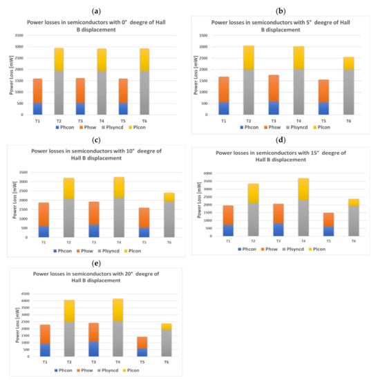 Top- and high-side switches division power loss of experimental results in the function of Hall B displacement: (a) 0 deg; (b) 5 deg; (c) 10 deg; (d) 15 deg; (e) 20 deg.