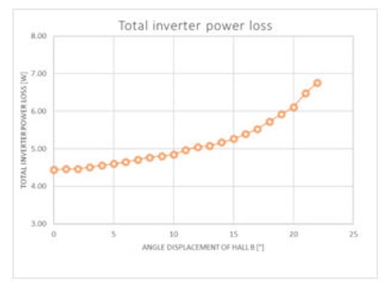 As the losses on individual components increase, the losses of the inverter as a whole increase. The results of the total inverter losses as a function of the HallB sensor placement error are shown in Figure 9.