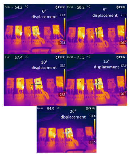 In order to verify the influence of the sensor arrangement asymmetry on the temperature of semiconductor switches, load tests were carried out with the rated torque for five values of the shift angle of the Hall B sensor (0.5, 10, 15, 20)°. Each of the tests lasted 10 min and were performed with a constant load moment. Before each subsequent test, the BLDC motor and the inverter were cooled down to the ambient temperature. The non-optimal positions of the Hall B sensor resulted in increased losses in the bridge. consisting of T3 and T4 transistors. In T4, there are additional losses related to the current flow through the body diode; therefore, the temperature measurement focus point is on transistor T4.
