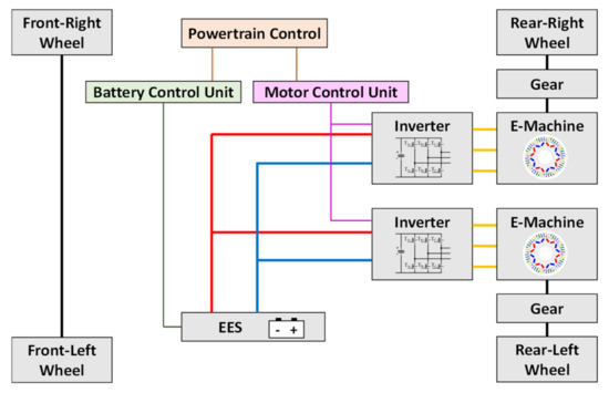 A full-electric vehicle model consists of the modeling of the vehicle body, suspension system, steering system, brake system, tires, and electric powertrain system [20]. Based on different ways of torque transmission, there are front-wheel driven, rear-wheel driven, and four-wheel driven vehicles. In this paper, a distributed rear-driven powertrain system is selected, which has an EES, two DC/AC inverters, and two electric machines connected to the rear-left and rear-right wheels through two gear groups, as shown in Figure 1.