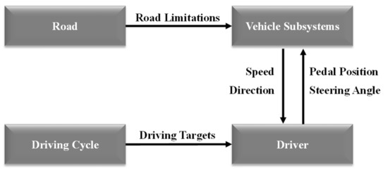 Besides various vehicle subsystems, the vehicle model also includes the modeling of the driver, road, and driving cycle. As described in Figure 2, the driving cycle provides driving targets (direction, speed, etc.) to the driver, which are used to determine the pedal position and steering angle inputs to the vehicle subsystems. At the same time, the road can provide driving limitations to the vehicle, such as maximum traction and lateral force based on road conditions. Vehicle maneuvering results are simulation outputs and are sent back to the driver to realize the close loop control.