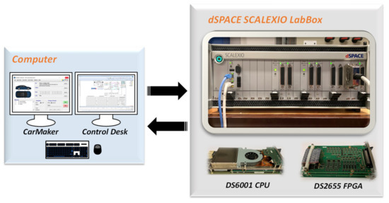 In this work, CarMaker from IPG Automotive is used to carry out the vehicle modeling, and XSG from Xilinx is used to carry out the electric drive modeling. Vehicle control functions and signal interfaces are implemented together with the vehicle model. As shown in Figure 3, a DS6001 board and a DS2655 board from dSPACE were selected as CPU and FPGA processors to run the vehicle model and electric drive model respectively in real-time. Control Desk from dSPACE provides access to tune model parameters and observe model variables. In the following subsections, interfaces between the vehicle model and the electric drive model are described.
