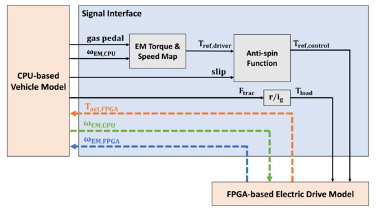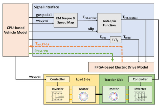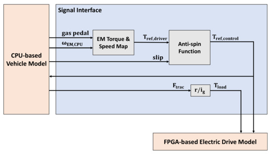 The latter one, on the contrary, sends rotor speed from the electric drive model () to the vehicle model (blue dashed line in Figure 5). The rotor speed calculation is kept in the electric drive model, unlike before. As explained, the rotor speeds inside the two models may not be exactly the same due to the sample delay in torque feedback. Therefore, in this interface, the rotor speed from the electric drive model may cause wheel speed deviation in the vehicle model. This is because the load torque is indirectly dependent on driven wheel speed via the slip ratio. The deviation of the wheel speed can cause the vehicle model to detect wheel slip inadvertently. The load torque, which is an input to the electric drive model, in turn, affects the rotor speed calculation. Hence, oscillations in the speed and torque may occur in this interface.