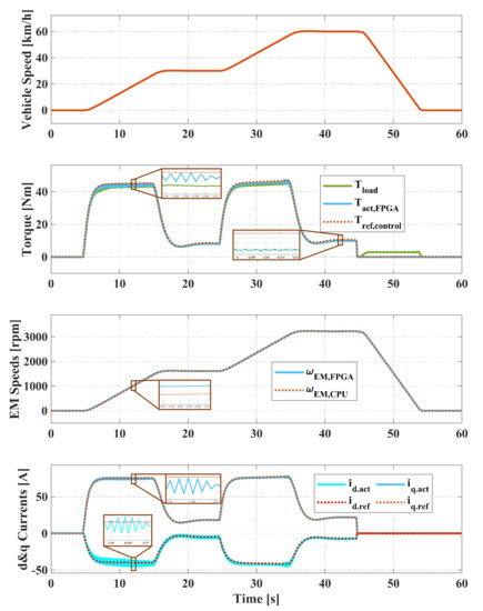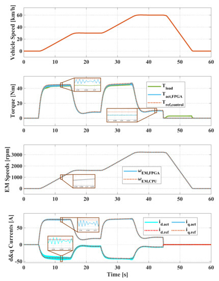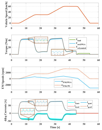 The real-time simulation results of the open-loop signal interface are shown in Figure 7. The first subplot presents actual vehicle speed from the vehicle model. It is followed by the torque subplot, where the adjusted reference torque (), electromagnetic torque (), and load torque () are shown. The third subplot compares the rotor speed from the electric drive model () and the vehicle model (). The final subplot shows the reference and the actual d&q axis currents in the electric drive model.