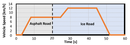 The driving cycle used in the anti-slip real-time simulation is described in Figure 11. The vehicle was accelerated from a standstill on a normal asphalt road to 8 km/h. It cruised at this speed and entered an ice road with a friction coefficient of 0.1. Then the vehicle was accelerated to 12 km/h, followed by constant speed driving. Finally, the vehicle was decelerated to zero speed. The closed-loop interface with rotor speed feedback from the vehicle model to the electric drive model was used.