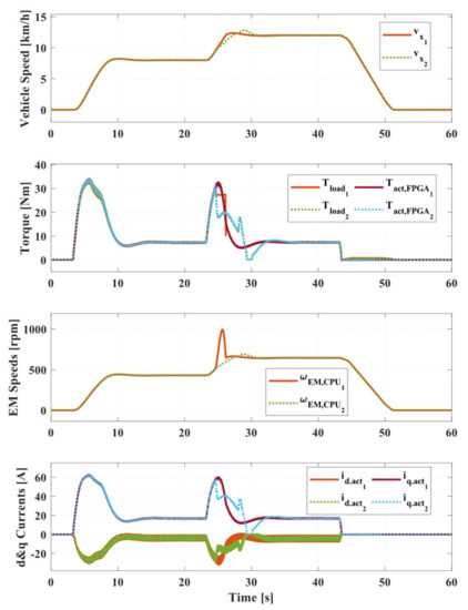 The simulation results of three closed-loop interfaces are shown in Figure 8, Figure 9 and Figure 10. The figures are plotted in the same order as described previously. In addition, the same speed-based driving cycle was used. The vehicle speed shown in Figure 8 also followed the drive cycle closely. The electromagnetic torque, during acceleration, was always higher than the load torque. This is because the electromagnetic torque was fed back to the vehicle model, which was used to calculate the load torque. As a result, the rotor speeds in both models followed the vehicle speed. However, the rotor speed in the vehicle model was slightly smaller. The sampling frequency of the CPU-based vehicle model is much smaller compared to the FPGA-based electric drive model. Therefore, the average electromagnetic torque was different in the two models, which can cause two rotor speeds to differ. This issue can be solved by using the second closed-loop interface, as shown in Figure 9. The rotor speeds from two models are almost identical, because of the speed feedback from the vehicle to the electric drive model. There will only be one sample delay caused by data transfer, which is negligible.