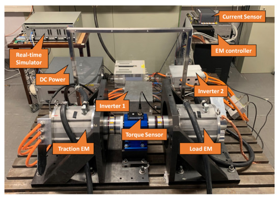 The FPGA-based electric drive model was verified using a back-to-back electric machine test bench, as shown in Figure 13. The test bench has two identical PMSMs driven by two IGBT-based two-level voltage source inverters. The parameters of PMSMs, inverters, and DC power supply were the same as the parameters used for modeling, which are listed in Table 1. The two PMSMs were connected via a shaft. One worked as a traction machine, while the other worked as a load machine. The DC links of the two inverters were connected together to the same DC power supply. This connection allowed the power to recirculate in the system. Hence, only the losses in the experimental setups needed to be supplied, putting less requirement on the DC power supply.