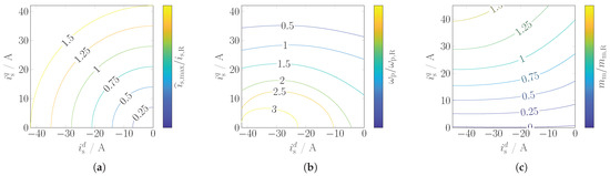 The constant is used to choose between amplitude or power invariant Clarke transformation, respectively. The right-hand side of (4) is obtained by solving (2) for and inserting the result into the middle part of (4). The sum of the stator and iron currents can be interpreted as magnetizing current. The machine torque of IPMSMs is highly nonlinear; an exemplary torque map is illustrated in Figure 4a. It shows the nonlinear torque of a IPMSM (used later for implementation) over the current locus overlaid by an exemplary reference torque (gray shaded plane) and the intersection torque hyperbola (black line) with the admissible currents pairs which can produce this desired torque. Moreover, several torque hyperbolas for several reference torques are projected to the current locus (colored lines). Figure 4b depicts the speed-dependent iron losses of the IPMSM. The current-dependent flux linkages and of this machine are shown in Figure 4c,d, respectively.