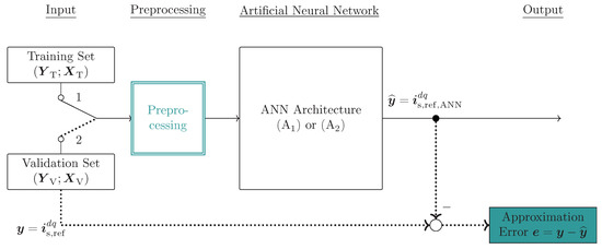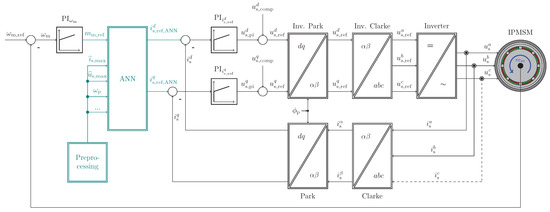 In this paper, in contrast to the conventional (LUT-based or numerically or analytically computed) OFTC approaches, an ANN-based OFTC for IPMSMs is proposed. Basically, the OFTC block in Figure 2 is replaced by a properly designed, trained and validated ANN as illustrated in Figure 6. Therefore, the modularity of the control system is preserved and the implementation effort is minimized. In addition, for the implementation of the ANN, (data) preprocessing is required in order to accelerate and improve training and validation and to assure the real-time capability of the ANN. The ANN will compute analytically but recursively the desired optimal reference currents which then are fed to the inner current control loop. The ANN-based OFTC is performed based on (a) its inputs (such as voltage and current constraints, reference torque, electrical angular velocity, etc.) and (b) its input, hidden and output ANN layers with simple but trained activation functions. The aimed at advantages of the ANN-based OFTC strategy are (i) a simple implementation, (ii) a faster computation of the reference currents than with classical ORCC (as no iterations are required) and (iii) no OOSS is necessary as the trained ANN directly outputs the optimal reference currents without following a decision tree (as required for conventional OFTC; see e.g., [4,25]).