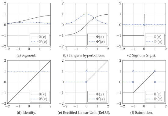 The core of each ANN are its neurons with their respective activation function ; recall (10), (11) and (13). Depending on the location of the neuron in the input, hidden or output layer, different activation functions have proven to be useful. Most common activation functions [64], such as sigmoid, tangens hyperbolicus, signum (sign), identity, rectified linear unit (ReLU) and saturation are illustrated in Figure 7. Their mathematical definitions with respective derivatives are collected in Table 1.