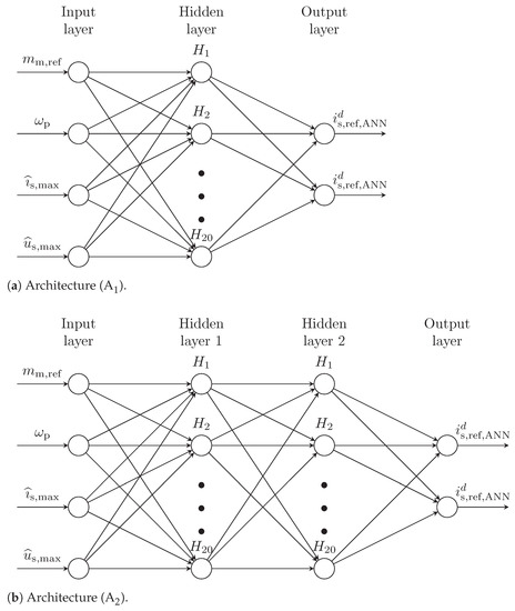 Another important application of ANNs is in the field of encoderless (or sensorless) control of electrical drives. In [49], it proposes a feedforward neural network (FNN) with one hidden layer capable of achieving sensorless speed control of an induction machine. The rotor angle estimation errors during speed transients are lower than . In [50], structured ANNs are used for saliency-tracking-based sensorless control of AC drives. The ANN designs are based on physical system knowledge leading to a fixed number of layers and neurons with physically motivated interconnections. Due to their structured nature, the trained ANNs provide physical insights as activation functions and weights have physical meaning. In [51], the rotor position of a switched reluctance machine is obtained with the help of an ANN used to estimate the unsaturated stator inductances. The proposed ANN has a very simple structure and reduces the computational effort significantly compared to conventional encoderless methods. In [52], it describes advantages and limitations of ANN-based encoderless control. In particular, at zero speed, the ANN-based encoderless control approach must be extended by conventional high-frequency signal injection methods. The additional consideration of the DC-link voltage improves control performance during field weakening. The used ANN has one hidden layer and is trained by supervised learning.