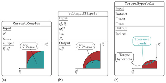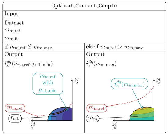 In this regard, the optimal feedforward torque control (OFTC) problem must be solved to compute optimal reference currents which minimize iron and copper losses by invoking optimal operation strategies for all operating conditions [4,5]. The different operation strategies are usually Maximum Torque per Ampere/Current (MTPA/MTPC), Maximum Torque per Losses (MTPL; considering also iron losses), Field Weakening (FW), Maximum Current (MC) and Maximum Torque per Voltage (MTPV). As alternative, Maximum Torque per Flux (MTPF) has been proposed as it is easier to compute, but it should be avoided as it represents an oversimplification with suboptimal operation and MTPV should be used instead [6]. All of those optimal operation strategies exploit the non-uniqueness of the current pairs which produce the same torque [4]. In order to minimize conduction and switching losses additionally, optimal pulse patterns (OPPs) must be implemented [7] which have to be computed separately for nonlinear machines with significant anisotropy [8,9].