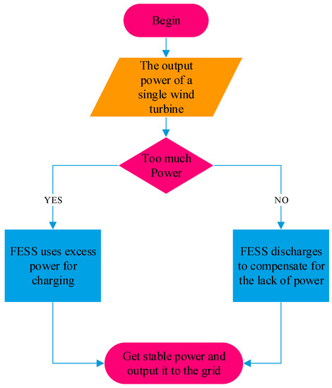 With the FESS in the power compensation phase, the control strategy of the power outer and current inner loops was used to perform real-time peak shaving for the power curve output by a wind turbine. When wind power is too great, the FESS uses the excess power to charge up; contrarily, the FESS compensates for fluctuating and/or extremely low wind power by discharging power more smoothly to the grid [21,22,23,24,25]. The FESS flow chart for the real-time compensation of wind power output by a wind turbine is shown in Figure 4. During the entire process, the FESS relies on the characteristics of rapid charging and discharging to achieve rapid real-time compensation for wind power. The FESS control block diagram based on wind power frequency modulation is shown in Figure 5.