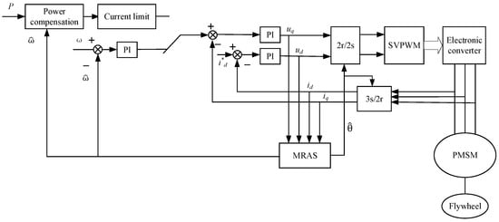 The MRAS used in FESS mainly comprises a reference model, an adjustable model, and an adaptive law. The basic idea of its estimation is to use the actual motor model as a reference, input the d-axis and q-axis voltage and motor current output into the adjustable model, and feedback the speed calculated by the adaptive law to the adjustable model to reduce error. Therefore, the speed and position of the rotor can be accurately estimated [18,19,20]. A specific working principle diagram is presented in Figure 2.