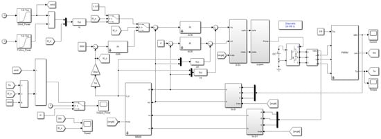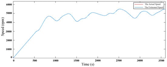 In Figure 7, the start-up phase is the maximum speed of 3000 rpm, and is obtained through the speed regulator (module ASR). In the power compensation stage, the module ‘Wind Power’ is the wind power output by the wind turbine, and the module ‘Follow Power’ is the adjusted power obtained under ideal conditions. The current value required to compensate the power is calculated from the rotational speed estimated by the module ‘MRAS’, and the current is limited to ensure that the work is within a safe range. and get and through the current regulator (module ACR). The module ‘2r–2s’ converts the variables in the two-phase rotating coordinate system into the variables in the two-phase stationary coordinate system. The module ‘SVPWM’ is used to output the pulse signal to the power electronic converter to control the operation of the PMSM. Modules ‘3s–2r’ are used to convert the variables in the three-phase stationary coordinate system into the variables in the two-phase rotating coordinate system. In the model, the and output by the PMSM are converted into , and , , which are further given to the module ‘MRAS’ to estimate the PMSM’s rotational speed, thereby obtaining the estimated rotational speed and the estimated rotor position .