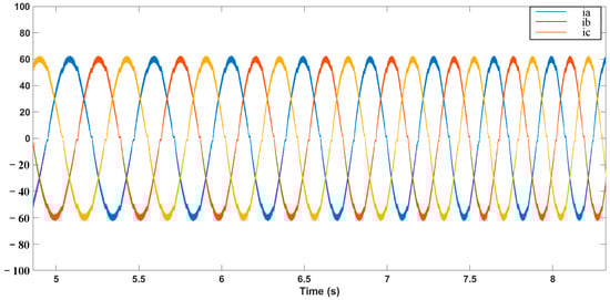 Figure 12 shows the three-phase current waveform, and the change in the current size is basically the same as the change in the size of the electromagnetic torque. Figure 13 shows the enlarged part of the current waveform, and it can be seen that the current fluctuation is very small, the period is approximately 0.51 s, and the initial phase angle is 0 rad. The amplitude of the current in the start-up phase is approximately 62.72 A. In the power compensation phase, the amplitude of the three-phase alternating current changes with the torque.