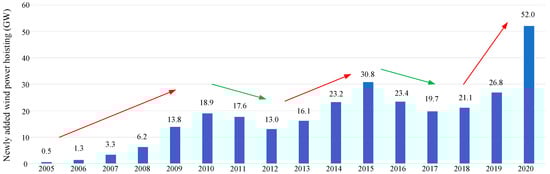 Reviewing the development history of domestic wind power, Figure 14 shows the new domestic wind power hoisting situation [29]. The development of domestic wind power can be divided into two major development stages: