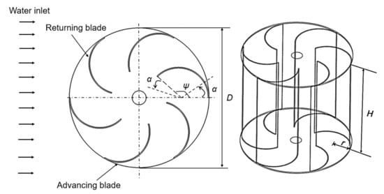 According to the alignment of the axis of rotation relative to the direction of the water flow, there are mainly two technologies applied to hydrokinetic turbines: horizontal-axis turbines [9] and vertical-axis turbines [10]. Horizontal-axis turbines have an advantage in terms of tidal and wind energy, but for small-scale energy conversion they are not cost-effective [11,12]. Vertical-axis turbines are mainly divided into two types [13]: drag-based Savonius and lift-based Darrieus. The Savonius turbine was invented by a Finnish architect, Sigurd J. Savonius, for wind applications in 1920 [14]. It is an energy conversion device that uses the difference in resistance between concave blades and convex blades to convert energy.