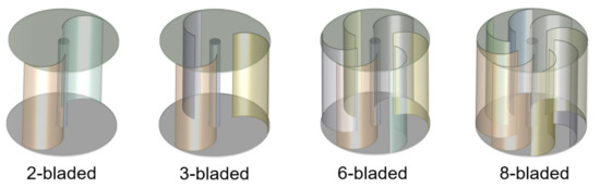 The geometry of the turbine for different numbers of blades ( = 0°, = 135°).