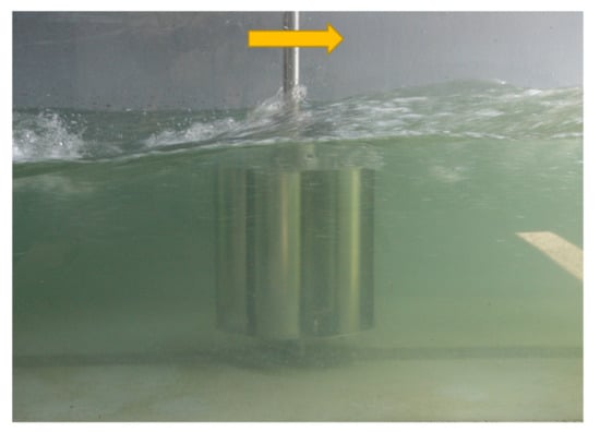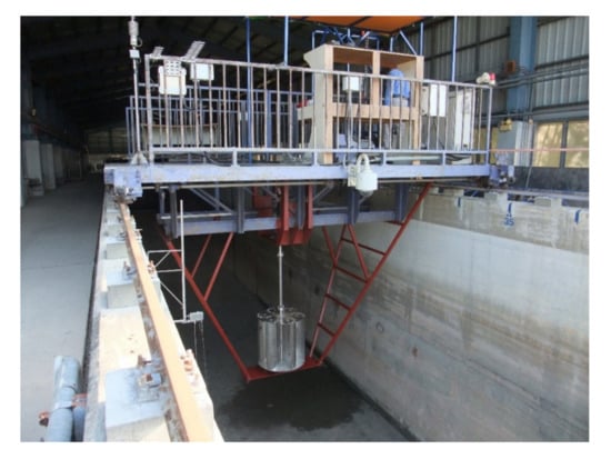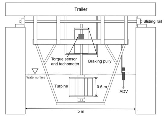 The turbine material settings and experiment model were all made of stainless steel. The turbine proposed in this study was considered to be able to actually operate and generate electricity, so a large turbine (60 cm × 60 cm) was used in the scale. However, due to the limitation of the site, it was difficult to conduct experiments. A towing tank test platform [33,39,43] was set up to conduct the experiments. The width of the towing tank was approximately 5 m, and the turbine was fully immersed. The depth of water in the towing tank was 0.9 m, and the distance from the water surface to the top of the turbine was approximately 15 cm. In order to measure the torque and rotational speed generated by the turbine, a torque sensor with an accuracy of ±1% and a tachometer with an operating range of 10–29,999 RPM and accuracy of ±0.05% were mounted on the towing tank experimental platform, as shown in Figure 5 and Figure 6. The setup consisted of trailer, a sliding rail, a braking pulley, and an acoustic Doppler velocimeter (ADV), which was used to measure the velocity of the water flow. The trailer drove the turbine to move forward and rotate at a fixed speed of 1 m/s by the slide rail and also drove the relative movement of the turbine and the water flow, so it successfully simulated the impact of the water flow on the turbine. Because the position of the turbine was driven by the trailer moving forward, the turbine was not affected by the size of the tank or the backflow caused by the water hitting the wall. The trailer was set to 1 m/s, corresponding to Re = . The flow states were turbulent. Figure 7 shows the rotation of the turbine in the towing tank. This paper is to study the performance of the Savonius-type hydrokinetic turbine. The amount of hydrokinetic energy contained in flowing water current depends on the water velocity. Therefore, it can be known from the definition of the power coefficient, the actual water kinetic energy captured by the turbine is dominated by the free stream velocity and the free flow cross-sectional area, not by the height of the effective head, as shown in Equation (3). Moreover, the cross-sectional area of water passing through the turbine is affected by the height of the upstream water surface rather than the downstream water surface. Therefore, the water depth is determined when the turbine is stationary in this study In the experimental setup, the depth of the water is ensured so that the entire turbine is submerged in water during operation. The main purpose is to study and discuss the operation and flow field changes of the turbine as a whole immersed in the water.