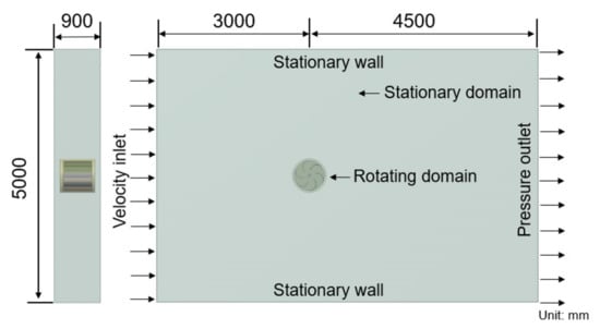 The overall three-dimensional computational domains were mainly divided into rotating domain and stationary domain. The rotating domain contains turbines, and the other domains were stationary domains. Since in the experiment, the trailer setting method is used, the turbine will not be affected by the disturbed water flow generated after hitting the wall and will thus not affect the efficiency performance. Therefore, in terms of the simulation, for the basin, no-slip wall surfaces have been used. This design ensures that the water flow hitting the wall surface will not bounce back to the turbine and affect its rotation. After the water flow hits the wall surface, the velocity on the wall surface is 0, and the water flow moves along the wall surface and away from the turbine, which is the same as concept for the experimental setup. The computational domains are set to be the same as those used in the experiment, for which the total length is 7.5 m, which is 12.5 times the diameter of the turbine, and the domain width is 5 m, which is 8.3 times the diameter of the turbine. A velocity of V = 1 m/s is set at the inlet, and a pressure outlet is set at the downstream outlet, which ensures that the upstream and downstream pressures are the same. The rest of the walls are all set to the boundary conditions of the stationary wall, which are adiabatic boundaries and do not affect any condition of the fluid in the analysis, as shown in Figure 8.