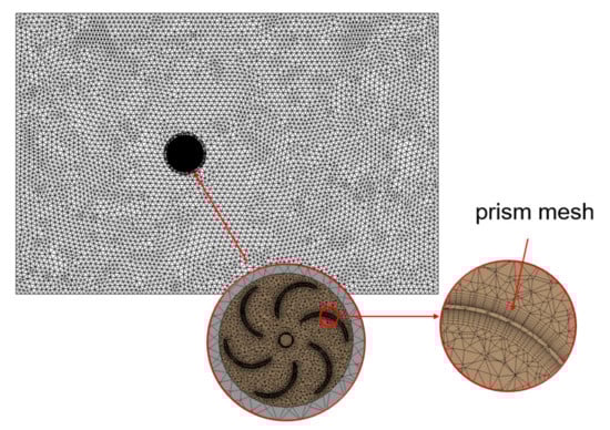The ideal grid design should consider the characteristics of the flow field and the computer performance to select the appropriate grid size and perform partial mesh refinement processing in the rotating area. Because of the complex geometry of the turbine, an unstructured tetrahedron mesh was used to create the mesh for the entire domain. However, considering that the viscosity of the fluid near the solid boundary layer changes significantly, for the surface of the turbine blade, a structured prism mesh was adopted. The inflation layer of the blade surface boundary layer consisted of the prism mesh with a first layer thickness of 0.5 mm and a maximum of 10 layers with a growth rate of 1.2, as shown in Figure 9. In the CFD simulation, the independence of the mesh had to be analyzed first. As shown in Table 2, a total of 7 sets of grid numbers ranging from 256,726 to 2,547,070 with average skewness of 0.58 which were generated to analyze the effect of the mesh number on the performance of the turbine and the hydrodynamic characteristics around the turbine. As the number of mesh elements increased from 256,726 to 1,093,773, the value of continued increased. However, when the number of mesh elements increased from 1,093,773 to 2,547,070, the value did not change to any significant degree. Therefore, 1,093,773 has indicated the convergence had been reached. In order to reduce the calculation costs, the total mesh number was set at 1,093,773 for the simulation.