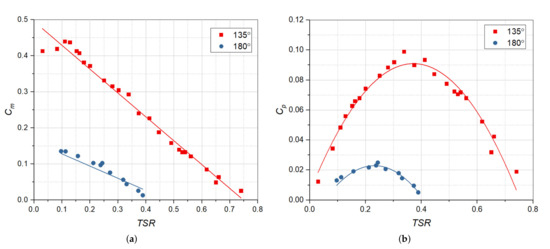 Many studies have pointed out that the shape of the blade has a great influence on the output power of a turbine [53,54]. First, the difference in the measured efficiency of the 6-bladed turbine ( = 0°) is discussed when the blade arc angles were 180° and 135°. As shown in Figure 10, the moment coefficient and the power coefficient were calculated to correspond to the TSR to evaluate the efficiency of the turbine. Without applying load, the TSR for a blade arc angle of 135° was approximately 0.75, which was 0.4 greater than that obtained for a blade arc angle of 180°, as shown in Figure 10a. Additionally, as the mechanical load increased, the rotational speed of the turbine decreased and at the same time, the torque generated by the turbine increased, so the of the 135° blade arc angle was greater than that for a blade arc angle of 180°. Furthermore, it can be seen that the value and TSR exhibited a quadratic curve. Figure 10b shows a of 0.099 at a TSR of 0.34 when the blade arc angle was 135°, and a of 0.0249 at a TSR of 0.244 when the blade arc angle was 180°. It is obvious that the blade arc angle of 135° had better efficiency performance because the increase in the vorticities decreased the hydrodynamic performance of the turbine.