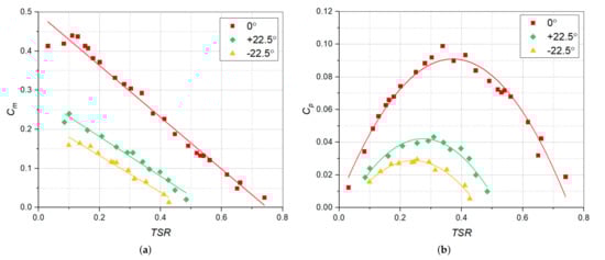 Variation in and with the TSR for the different blade placement angles (). (a) vs. TSR, (b) vs. TSR.