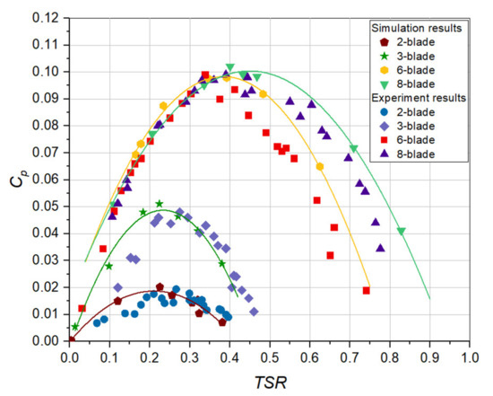 Effect of the number of blades on the power coefficient for different TSR values (experimental and simulation results).