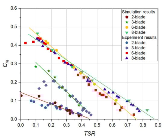 Effect of the number of blades on the moment coefficient for different TSR values (experimental and simulation results).