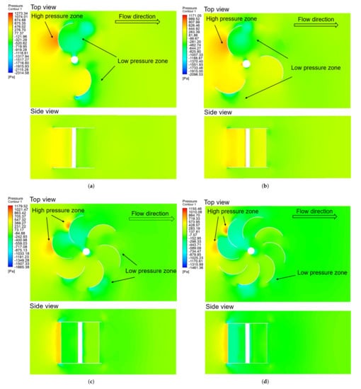 Figure 14 shows the distribution of the pressure contours among the two, three, six, and eight-bladed turbines at TSR values corresponding to the maximum power coefficient. It was observed that a pressure drop through the turbine occurred from upstream to downstream. The blades were driven to rotate because the concave surface pressure of the forward blade was greater than that of the convex surface. The eight-bladed turbine produced more positive torque due to a greater number of advancing blades, but at the same time, there were also more returning blades that provided negative torque, so the output power compared to the six-bladed reached convergence. However, its output power was still much higher than that of the two- and three-bladed turbines, which was determined by comparing the pressure difference between the upstream and downstream of the turbine. It was also observed that the high pressure zone on the convex surface of the returning blade decreased with increases in the number of blades, which reduced the amount of negative torque generated, and also indicated the consistency between the results for the simulation and the experiment. Based on the CFD simulation results, it was observed that increasing the pressure area on the concave surface of the advancing blade and reduced the pressure distribution on the convex surface of the returning blade affected by the impact of the water flow, which was the key to improve the performance of the turbine.