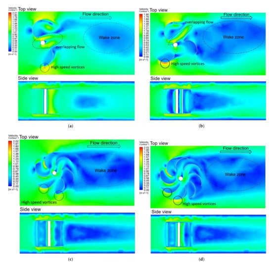 Figure 15 presents the distribution of the velocity contours among the two, three, six, and eight-bladed turbines at a TSR corresponding to the maximum power coefficient. The velocity of the water flow was constant before entering the turbine rotating domain. When the turbine rotated, it was observed that there was a high-velocity area at the tip of the advancing blade. On the other hand, a wake zone was generated downstream of the turbine. It is worth noting that the advancing blade tip of the two-bladed turbine had a more intense velocity flowing from the tip of the blade than was the case for the other turbines with more blades. This phenomenon led to a negative impact on the blade–fluid interactions, which deteriorated the efficiency of the turbine [15]. A higher velocity zone was observed at the top and bottom side, as shown in side view near the end plate. It can be observed that as the number of blades increased, this phenomenon decreased significantly, in turn improving the efficiency performance. Moreover, the overlapping flow, which can enhance the torque of the turbine, was observed to be strong on the concave surfaces of the returning blades in the case of the six- and eight-bladed turbines. However, for the eight-bladed turbine, the overlapping flow increased the hydraulic resistance of the turbine without sufficient hydrokinetic energy to impact the blades, so the performance of the six- and eight-bladed turbines was about the same. On the other hand, it was observed that the overlapping flow in the two- and three-bladed turbine left the turbine without impacting the other blades and passed through the turbine downstream. This produced vortices on the concave surfaces of the returning blade and caused a decline in the performance of the turbine.