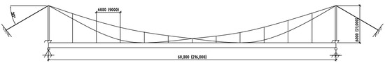 Figure 1 shows the general layout of the suspension bridges with a length of 60 m and 216 m. For the bridge with a length of 216 m, the dimensions are shown in parentheses.