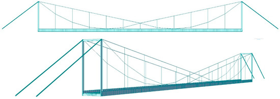 The calculations of strength and flexural stiffness of pedestrian single-span suspension hybrid bridges were performed in the Midas/Civil 2019 (v2.2, build 16.04.2019) [