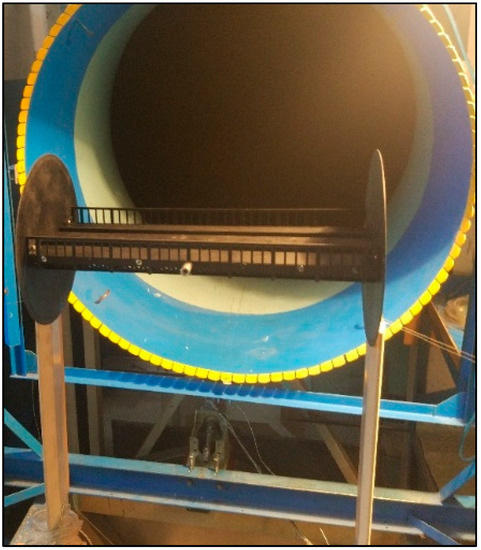 28]. The distribution of wind speed in height has a law close to an exponential function. However, it was found that the change in the flow velocity along the height of the superstructure model is relatively small when Equation (6) will be fulfilled. Therefore, it is permissible to use a constant velocity along the height of the model in experiments: