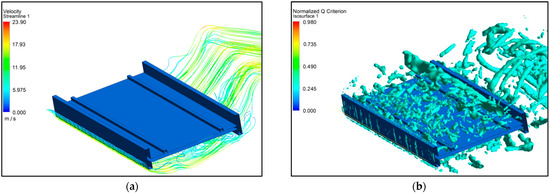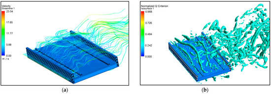 Figure 8a, the permeability of the walls leads to a decrease in the vertical extent of the tear-off bubbles and their fragmentation. At the same time, a zone of synchronized vortex shroud vanishing occurs near the front wall (the “tubular” shape of the fragments of the isosurface of the Q-criterion) and are presented in