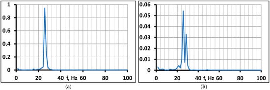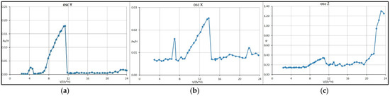 Figure 10a). Oscillations in the vertical plane have a similar character. In the first velocity range corresponding to V/f