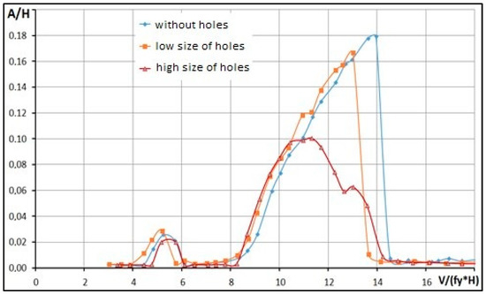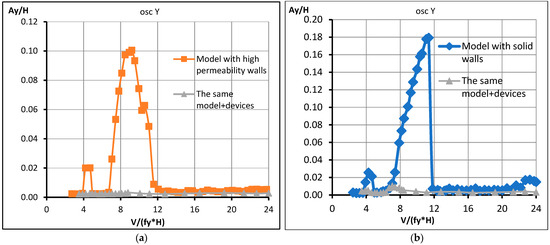 Figure 11, for all three variants of graphs there are two ranges of relative velocities (V/fH) in which aeroelastic oscillations occur. In the first range corresponding to V/fH~5–6, fluctuations with moderate amplitudes reaching A/H from 0.02 to 0.03 are observed. The second speed range starts at V/fH~8 and continues to V/fH~14; it corresponds to much more intense oscillations. For models with solid walls and walls with small perforation, the oscillation parameters do not differ much, their maximum amplitudes reaches 0.17–0.18 at speeds V/fH~13–14. After this range, the oscillation intensity dropped sharply to almost zero.