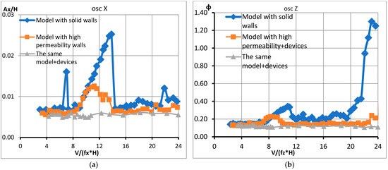 Figure 14a,b. As can be seen from the graphs, in the studied speed range, the oscillation amplitudes of models with devices have slightly decreased compared to models without devices, and do not exceed A/H~0.005–0.006 and ϕ~0.1–0.12 degrees.